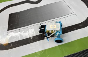 写真は「ライントレース」といって黒線のみをロボットにたどらせるミッションの様子です(^^♪