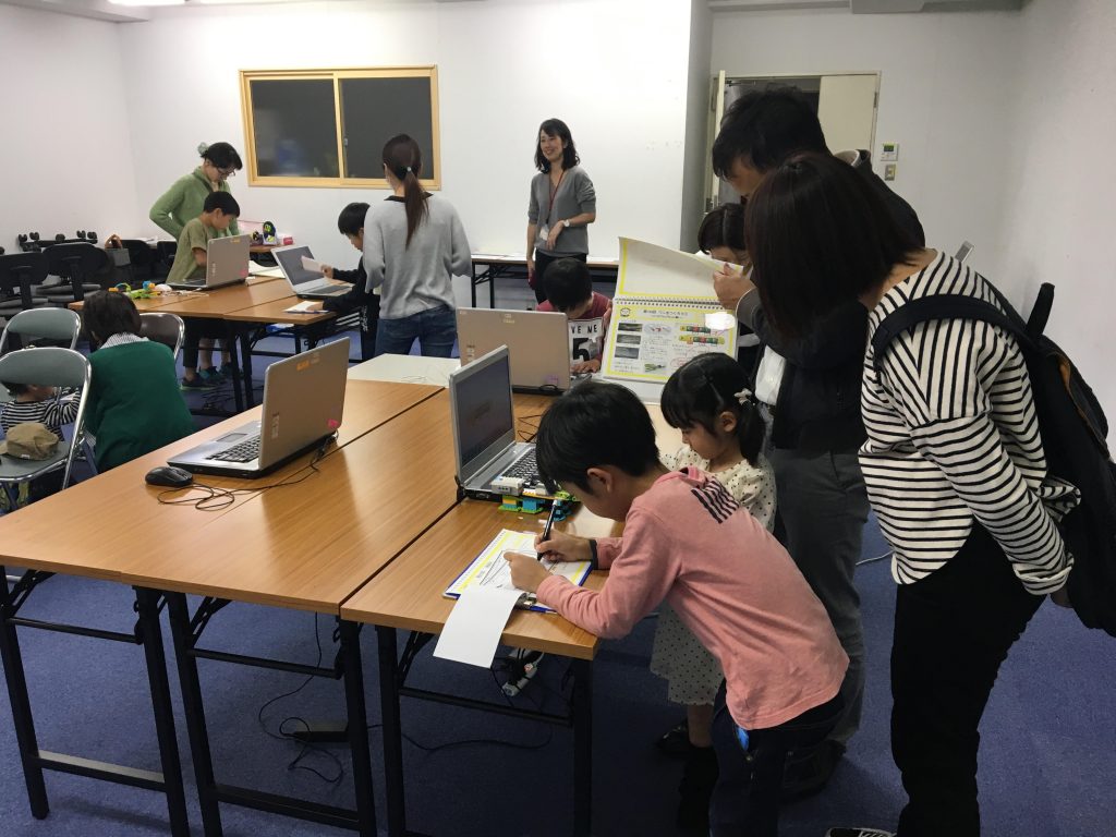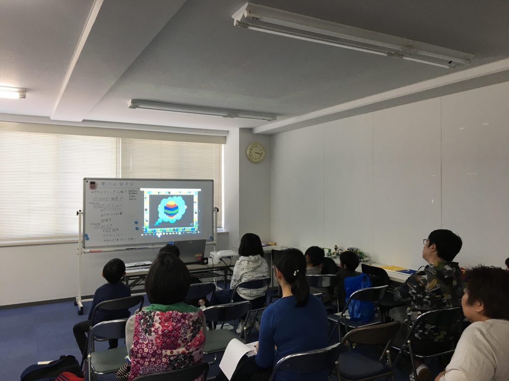 発表会とは、保護者の皆様にお集り頂き皆さんの前で一人一人が作成したロボットについて発表します。その後、日ごろお子様が一生懸命作成している作品をご覧いただき、実際にプログラミングで動かしてみて楽しんで頂いております。