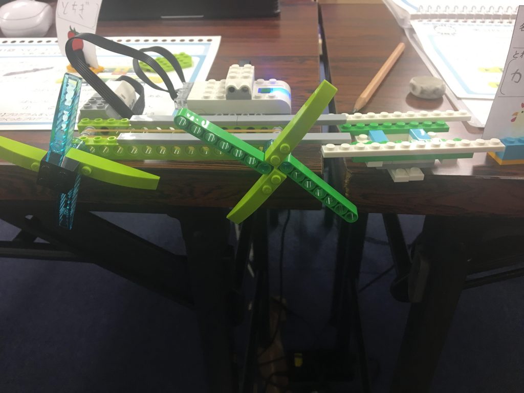 課題にクリアしたお友達は早くも改造をはじめていました。お友達とつなげて長さをだしたお友達、扇風機みたいな羽をつけたり、飛行機を運びたいといったり、全員が一生懸命考えて作品をつくりあげました。