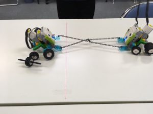 前回勉強したことをふまえながら、プルロボットを改良し、お友達と綱引きを行いました。