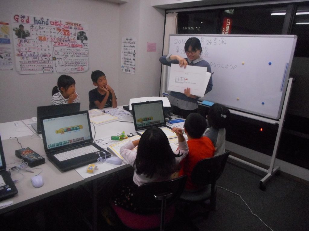 お父様、お母様にPCを使ってプログラミングを説明します。